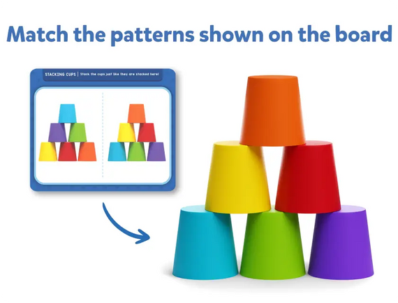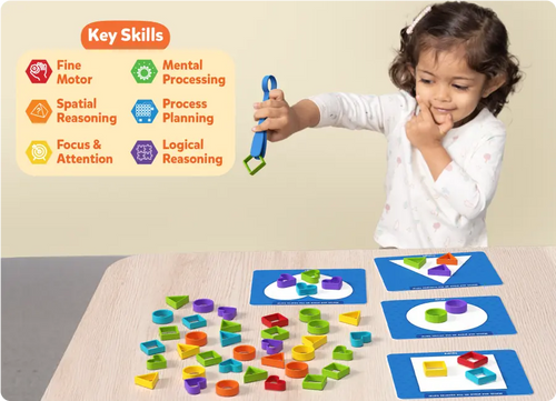 Using easy-to-grip tongs, young children can pick up and arrange colourful shapes into their cups, boosting hand-eye coordination and dexterity while learning to sort colours and shapes. The fun expands with 4 double-sided activity boards featuring additional games like bingo, stacking, sequencing, and counting-providing hours of educational entertainment!